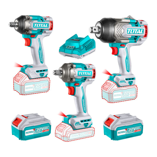 Kit Inalámbrico 20V 3 Llaves de Impacto 1350Nm + 500Nm y 400Nm TotalSKU: THTP1304205 El kit inalámbrico Total 20V incluye tres llaves de impacto co...