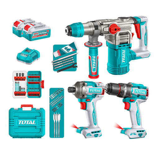 Kit Taladro 96Nm + Atornillador 285nm y Rotomartillo InalámbricoSKU: TOSLI250693 El kit Total 20V reúne un taladro percutor de 96Nm, un atornillado...